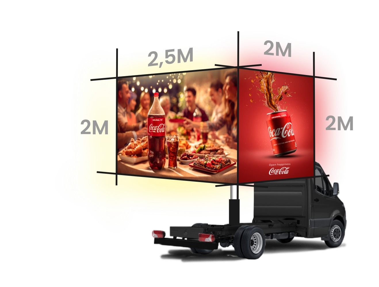 1. Visibilidade mob360: Com a suspensão ativa as três telas de LED simultâneas que exibem conteúdo em todas as direções, sua marca será vista de qualquer ângulo, maximizando o impacto e o alcance da sua mensagem.